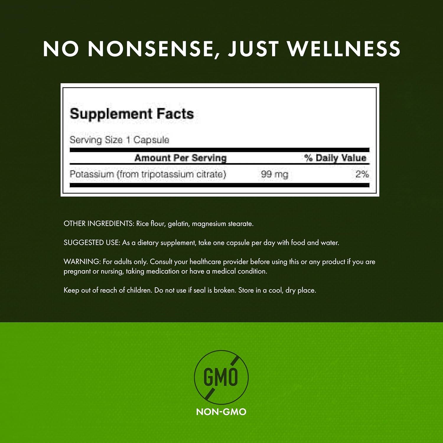 POWERFUL FORMULA: Our potassium citrate capsules support the body with vital nutrients promoting kidney health and nerve function. This formula delivers 99mg in a small, easy to swallow capsule you can take daily.