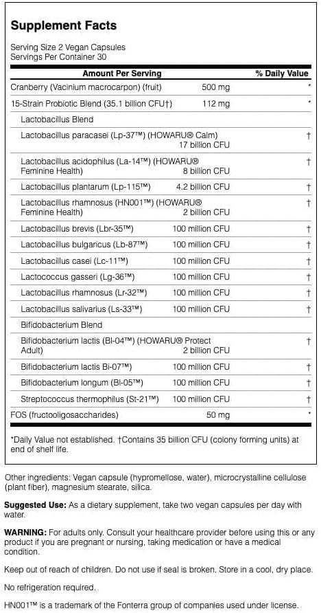 Functional cranberry and prebiotic FOS paired with 35 billion CFU per serving from 15 targeted, shelf-stable probiotic strains including doctor-trusted* L. acidophilus NCFM